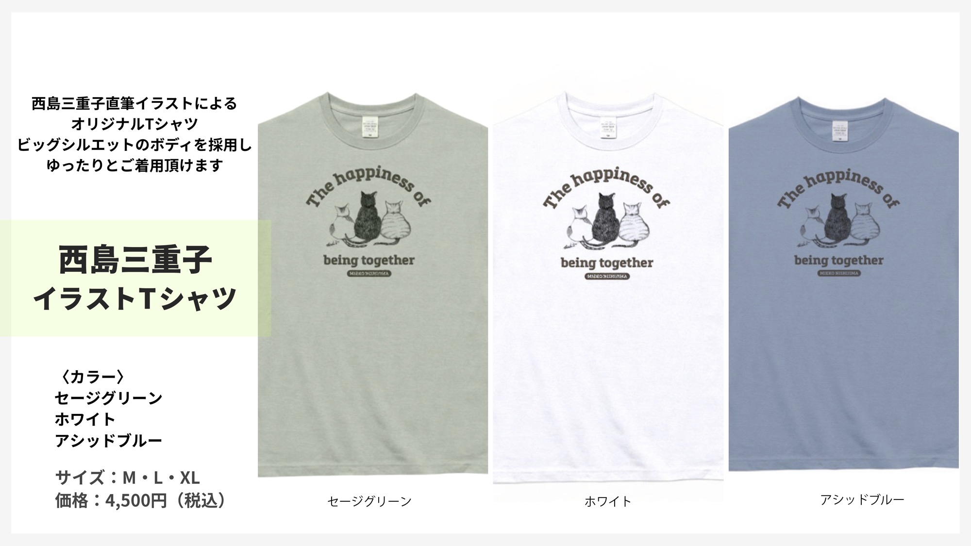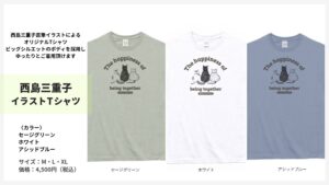 【グッズ情報】西島三重子直筆イラストTシャツ 2026年3月4日 mieko_n 西島三重子直筆のイラストをあしらったTシャツが登場。 ボディは3色カラーをご用意、ビッグシルエットとなりますのでゆったりとした着心地サイズとなります。 3月14日の南青山マンダラライブよりの販売となりますので、是非お買い求めください。 西島三重子イラストTシャツ 価格:4,500円(税込) カラー:ホワイト・セージグリーン・アシッドブルー サイズ:M・L・XL